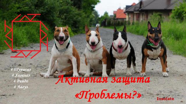 Турсы ассоциируются с бесами, а бесы часто приходят в образах собак. Бойцовские собаки всегда готовы к нападению – дайте им только возможность. А еще Турисаз – это и пассивная защита (шипы терна), и активная (шипы на щитах викингов, которыми можно нанести хорошие увечья). Как, впрочем, и бультерьеры — уже один их вид является хорошим «сдерживателем» для любителей конфликтовать, ну а если уж конфликт произошел, то по активности «нападения» им нет равных. Но все таки Турсы – великаны, а это не совсем бесы, и защита хорошо гоняет пришлых бесюков, а от мертвых – скорее пассивная, но ТТТ, ничего не цеплялось.