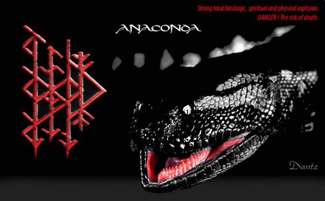 По секрету, опишу работу «челюстей» Анаконды. Альгиз и Перт. Точнее вязь из Перт и две Альгиз (прямая и перевёрнутая — «древо жизни»). Таким образом образовывается вязь, известная как «ОРАНТА» — поступление энергии ото всюду. Но если ты посмотришь, что с этим поступлением делает Анаконда, то всё встанет на свои места. Перт зажат аж двумя Турсами для помех, приостановки и перекрытия, и затухания тока энергии, что выражено перевёрнутой Тейваз пер.+Ансуз пер.+Ис, расположенной на оси стенки руны Перт. А расположенная по другую сторону от Перт перевёрнутая Кано, дополнительно всё задувает чтоб вообще ничего не грело.