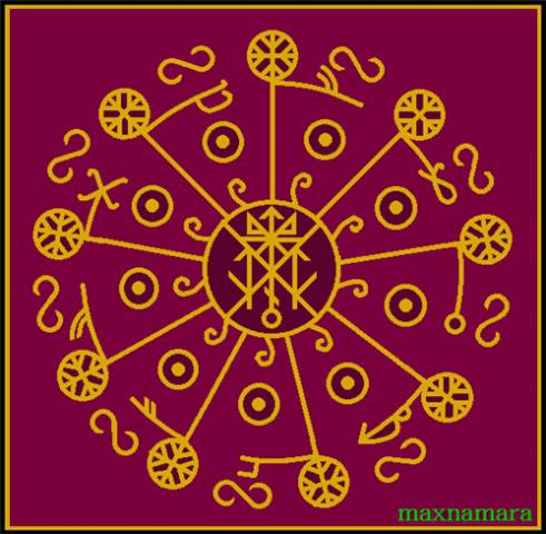 Можно рисовать произвольно, но может быть лучше рисовать сначала середину, а потом лучи и руны на них, поворачивая став по часовой стрелке. Эльфийскими рунами написано название става. + руна эльфийского морока æ- руна эльфов дня, + b-руна эльфов дня для усиления магии става. Также Йотунский морок, и защита сего мероприятия (перекрещенные альгизы в окружностях), также и защита середины става. Внутри руны старшего футарка: руна на которой построен весь став — Гебо ; Сол+Наутиз+Тейваз+Тейваз +Тейваз (что выходит из Берканы), проходят сквозь Манназ+Кано+Лагуз в Перто+ Беркана…на выходе из Берканы два Вуньо, можно также оговорить 2 Турисаз зерк. и прям. в середине става, а можно и не оговаривать. Турисаз обычно оговаривается как страсть. Да, крючочки, которые идут посолонь, защита и успех, которые предают мягкость ставу — это гренландская литера успеха, процветания и победы, она без отдельного названия, так как является по сути алфавитной, хотя и несет магическое значение.