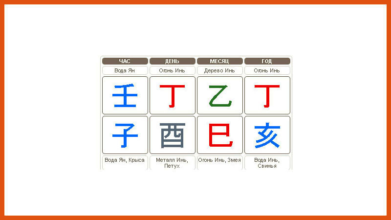 Как видно по столпам судьбы этого мужчины, его стихией личности является огонь. Он поддержан еще двумя стихиями огня и одной — дерева. Подавляется огненная стихия этой натальной карты тремя элементами воды и одним — металла. Энергий, питающих и ослабляющих основную энергетическую единицу, в данном случае равное количество. Поэтому можно сделать вывод, что этот человек родился с уравновешенными, но неполноценными столпами, ведь в них нет пятого элемента — земли. Чтобы выявить благоприятные и неблагоприятные энергии для этого мужчины, необходимо узнать, в каком периоде жизни он находится в данный момент.