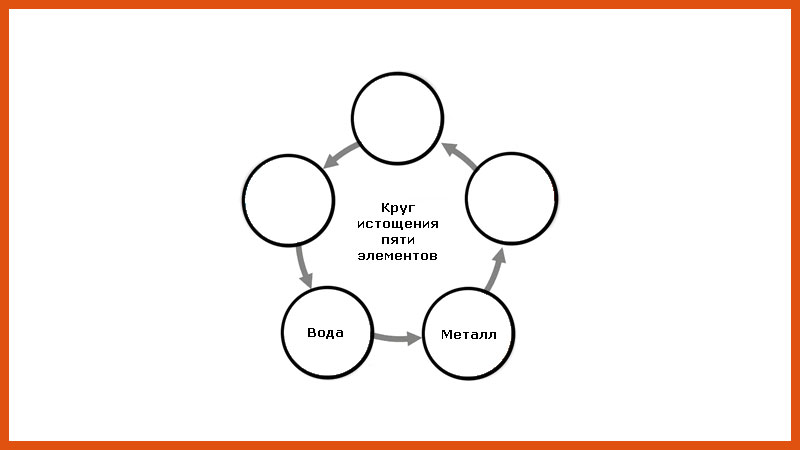 Правила фэншуй указывают на то, что пять элементов способны истощать друг друга. Это когда одна стихия ослабляет другую. В данном случае металл всегда слабеет, если появляется вода. Этот принцип можно увидеть в физическом мире, на примере льда, попавшего в жидкость. Из-за воздействия последней, он начинает быстро таять. Жидкости становится больше, а лед полностью исчезает. Подобное поведение стихий наблюдается, если рассматривать все пять типов энергий.