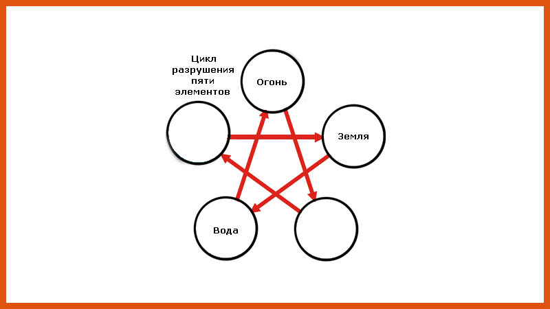 Согласно теории фэншуй, пять элементов взаимодействуют между собой, уничтожая друг друга. В данном случае вода способна полностью залить огонь. А водную стихию обычно останавливает земля. Другими словами — энергия земли может уничтожить воду. И первый и второй принцип взаимодействия наблюдаются в физическом мире. Чтобы создать водохранилище, строят дамбу. А огонь костра заливают водой.