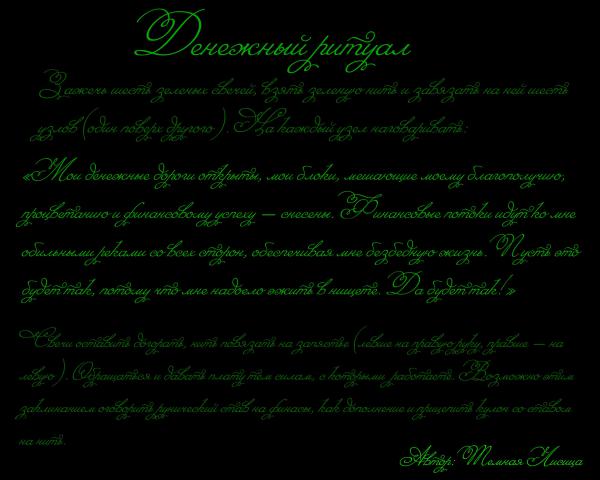 «Мои денежные дороги открыты,мои блоки, мешающие моему Благополучию, Процветанию и моему Успеху-снесены. Финансовые потоки идут ко мне обильными реками со всех сторон, обеспечивая мне безбедную жизнь. Пусть это будет так, потому что мне надоело жить в нищете. «Да будет так!»