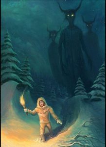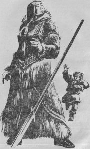 Тунгак прилетел. За спиной два черных крыла, глаза с котелки размером и горят словно плошки. Уши как у оленя, шкура и волосы на нем густые да длинные, ноги и хвост точь-в-точь собачьи. Ручищи здоровенные — до колен ладони достают и на каждом пальце по железному когтю размером с острогу. Подошла тень к яранге, встала на четыре лапы и изо рта тушу моржа рядом с домом на землю бросила. Девушка смотрит во все глаза, взгляд от щели в пологе оторвать боится. Собака только наружу хотела вылезти — та ее сгребла в охапку и рот зажала, чтоб не услышали.