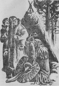 Дни стали короче, ночи холоднее, стынет лед на лесных озерах. До морозов девушка каждый день ходила на охоту и рыбалку, запасы в яме пополняла, да только все равно мяса на зимовье не хватило бы. Наступили холода, заметать пургой, засыпать снегом стало старое стойбище. Перестала девушка на охоту ходить — одежда зимняя у нее прохудилась, а починить нечем. Ни иголки, ни нитки у нее с собой нет. Пришлось сидеть дома. Собака ей то тетерева, то рябчика принесет, то куницу, тем они и жили.