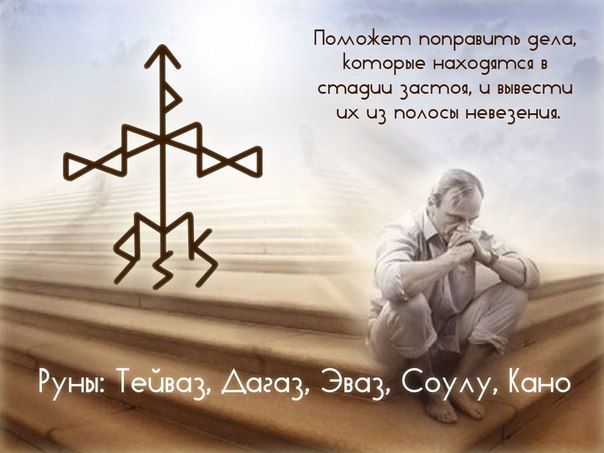 В центре руны Тейваз, Дагаз и Эваз, что означает: Тейваз — укрепление решимости, воли и разума, помощь в соревнованиях и повышение бдительности; Дагаз — руна трансформации и преобразований, единения и завершения; Эваз — для подталкивания и изменения какого то процесса, выведение из спячки и новые начинания. А по вокруг более мелкие вспомогательные руны: Соулу — обретение силы для победы, вдохновение и надежда; Кано — озарение, творческая активность, энтузиазм + два дополнительных Дагаза для усиления эффекта центрального Дагаза.