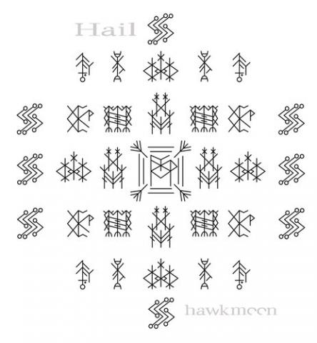 Гар + Хагалаз + 4 Хагалаз (звездочкой, на ножках первого Хагалаза) + 2 Турисаз + Ior (нортумбрий) + 2 Yr вп (нортумбрий, вариант написания как перевернутый альгиз) — четко и точно бьют в цель по негативу, отсекая и уничтожая его, освобождая позитиву дорогу, давая ему возможность взять верх и изменить судьбу и жизнь, продолжив ее без того дерьма, что льет по роду.