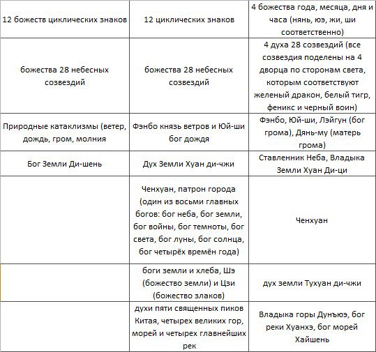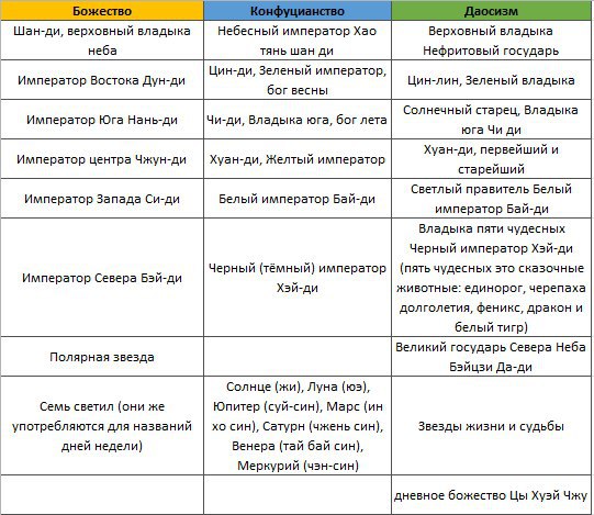 Итак, перед нами — философские течения с разными богами, но с похожими, если не идентичными, выполняемыми ими функциями. Во избежание путаницы в работе с восточными божествами, ниже вы найдете соответствие даосских и конфуцианских божеств: