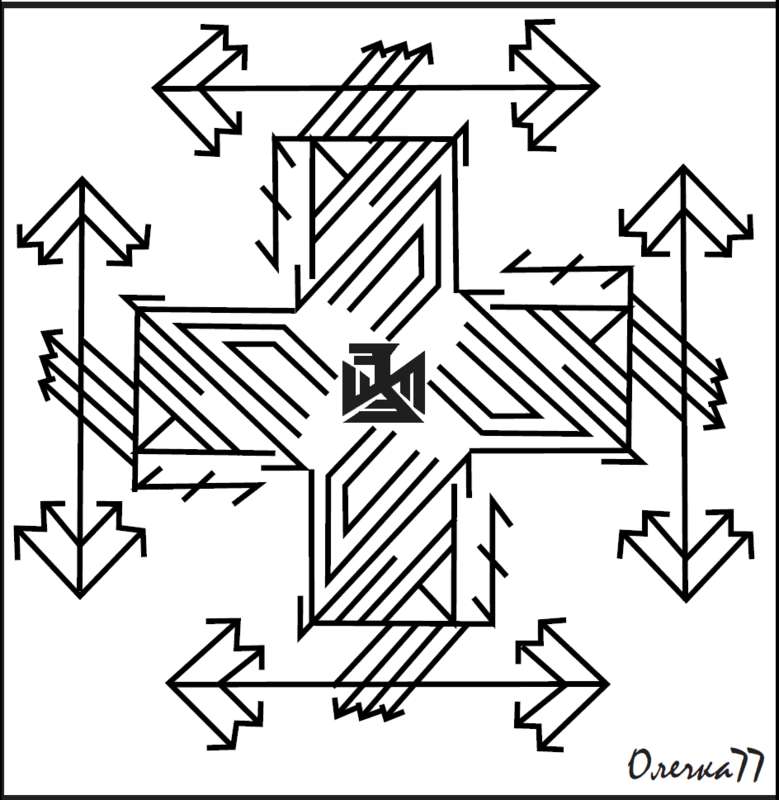 Центр: Символ Бога Семаргл — это пламенная Сила. Огонь – всесильная и загадочная субстанция. Все народы мира считают его очищающей природной силой. Он очищает от страхов и тревог, от порчи и сглаза, от болезней и врагов. Недаром огонь горит во всех святилищах независимо от их религиозной принадлежности. Огонь является семиглавым, отсюда собственно и его имя – Семаргл. Каждая голова Семаргла – это Ангирас (современное – ангел), огненная сила-посредник между людьми и богами.