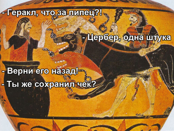 Герой отвел бедного песика к Еврисфею, который не сильно обрадовался подарку.