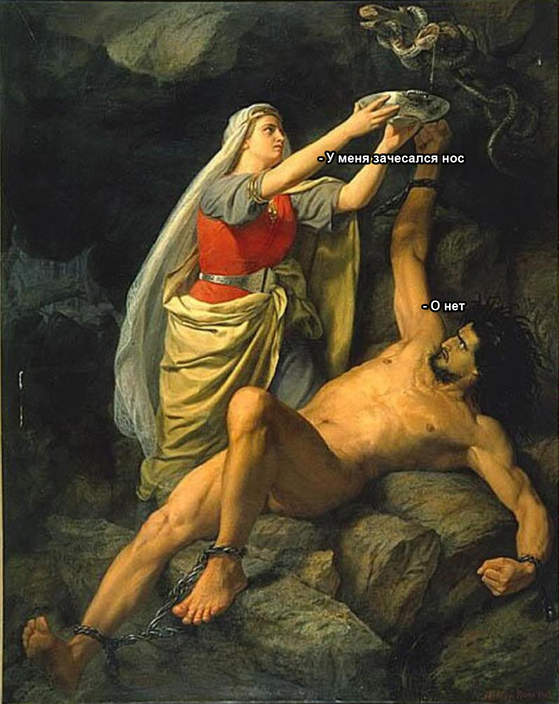 Туда же привели сыновей Локи. Тех, которые нормальные, Вали и Нарви. Вали боги превратили в волка, и тот разорвал своего брата. Боги взяли кишки Нарви и привязали ими Локи к скале… Ой, тут же дети. Уберите детей опять… ай ладно, уже поздно. Ну кто сейчас без психологической травмы, да?