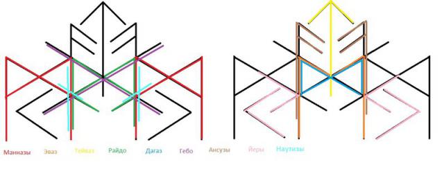 Эваз + 2 Райдо прям и зерк.+ Наутиз + Дагаз +Тейваз — сведение дорог, притяжение друг к другу, встреча и мощный толчок к этой встрече и невозможность её избежать, так или иначе, встреча состоится и будет довольно благоприятной.