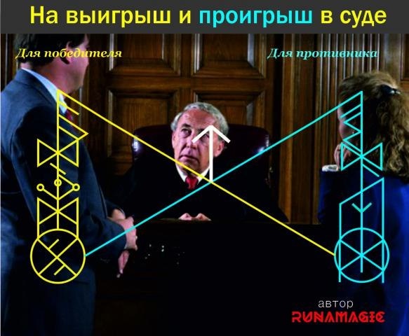 Желательна фотография судящихся. Если нет наносим на огурец. Желтую формулу наносим на того, кому нужно выиграть. Синюю, кому проиграть. Соединяем 2-х кандидатов руной дагаз и направляем на вердикт, положительный для нас.