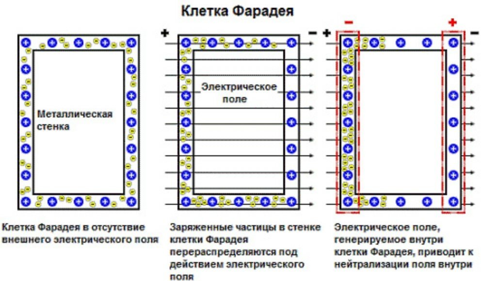 Без шуток. В конструкцию сего прибора входит так называемая клетка Фарадея. Замкнутая электропроводящая оболочка, которая не пропускает электромагнитное поле. Работает она по принципу, кратко изложенному на картинке. Именно благодаря этой штуковине микроволны греют если не пищу, то хотя бы тарелку под ней, а не вас и все остальные предметы. Клетка Фарадея просто не выпускает электромагнитное излучение наружу. Но одновременно с этим она не пускает его внутрь. Так что можете прятаться там от всего сколько захочется.