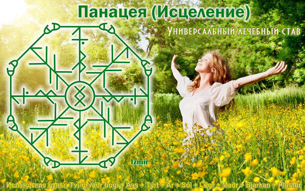 Действующие руны: исландские руны Tví-örvaðr bogi + Áss + Týrt + Ár + Sól + Lögr + Maðr + Bjarkan + Plástur.