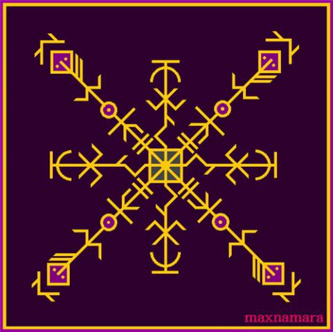 Косые: Æsínger+Stunginn kaun (для жуткой боли и смерти), fé (чтобы жертва перед смертью потеряла все), elli-hvíld+морок (пока жертва сохнет и гниет – ничего не понимает), týr+úr (для вызова (духов и мертвяков), Эар (идущая внутрь става, для самовозгорания в агонии).