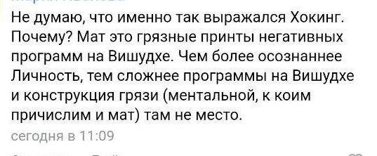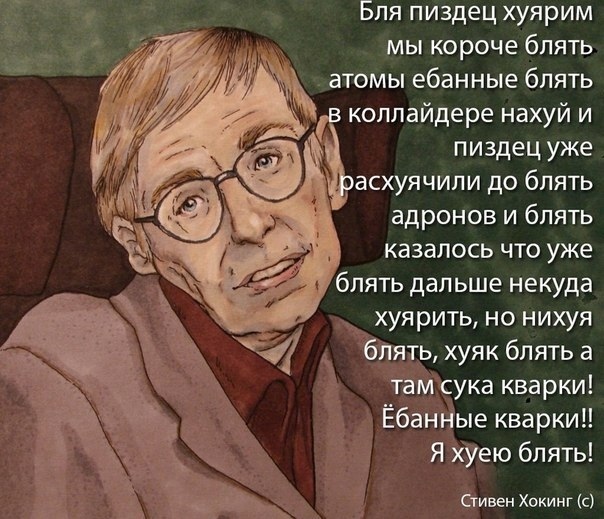 Позавчера запостила в ВК картинку со Стивеном Хокингом, который матерится на кварки. Мне показалась смешной эта карикатурная гиперболизация, что поделать… Есть такой приём в литературе, когда нарочито неподходящие рамки устанавливают на другой объект, чтобы высмеять первичный. Проще говоря, представив как Хокинг наморгивает (намаргивает?..) глазом текст, который скорее можно услышать в какой нибудь шараге, мы высмеиваем не Хокинга, а шарагу. Я не думала, что такие вещи нужно объяснять кому-то, но в комментариях тут же отметились моралфаги, которые, поджав губы, стали брюзжать что то о негативной энергии мата и грязи. Повторяя чьи то умные (нет), и явно чужие слова. Знаете, что я вам скажу? Да ебись они конем, эти ваши правила! Мы тут и так задыхаемся в тисках всяких норм, правил, законов, требований… Вам их мало? Давайте себе еще придумаем правила, запрещающие говорить слово «стол» по четвергам? Или дышать левой ноздрей? Хотя нет, левой запрещено по первым и третьи четвергам, а правой — по вторым и четвертым вторникам. Это никому не нужно, но просто чтоб вы заебались пошибче.
