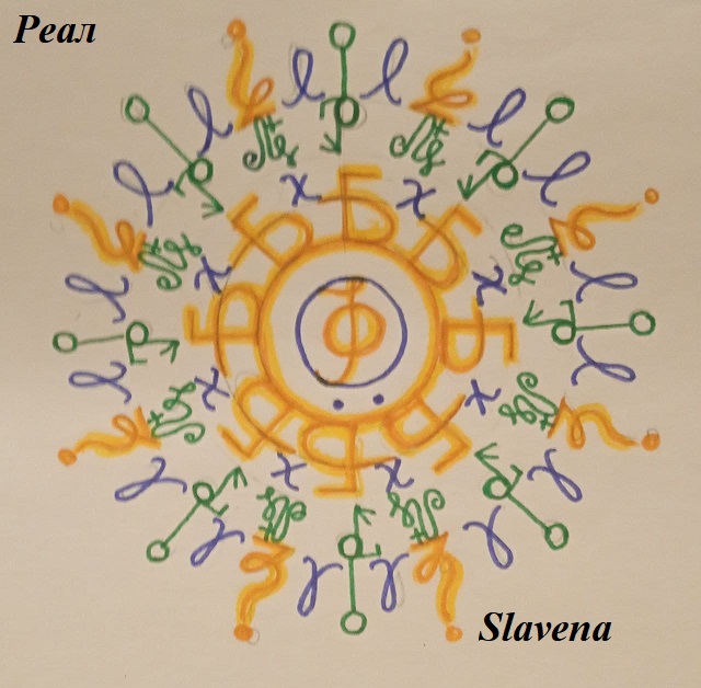 Центр- буква Ферть в круге буквы Рикё и всё это в Коло. На Коло буква Бысть – 8 штук, между Бысть буква Ксь – 8 штук; буква Труд – 8 штук, буква Деньга- 8 штук; и завершающий круг : Имми – 8 штук, Лучина – 8 штук, Люди- 8 штук.