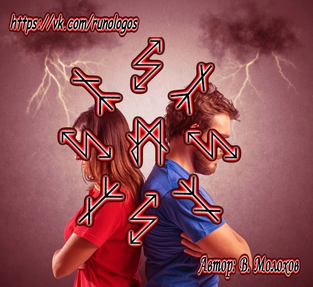 4 Науз + Райдо (перевернутое положение) + Гебо — сама программа, которая направляется на объект воздействия. Принуждение к разрушению связи с противоположным полом, коллегой по работе или же с группой людей.