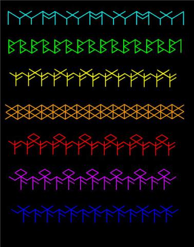 — Голубой — изначальная сила природы, порядок и правильность происходящего: Уруз прямой и зеркальный (как символ двойственности и равновесия силы), славянская руна Даждьбог, нортумбрийская руна Ас (божественная сила в действии), Эваз.