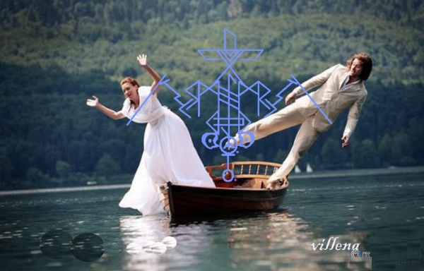 В центре – Эйваз. Обозначает вообще всё, что связывает между собой двух людей, как то привычка, дети, общий дом, теплые тапочки)…и т.д. У каждого свои привязанности, всех знать невозможно. Эти привязанности между двумя Манназами разбивают три Хагалаза. Сверху, над Манназ сами существующие в данный момент связи между людьми: семья, работа…и .т.д. Они разбиваются тремя Турисаз, усиленными Уруз. После того как связи разбиты, человечки разбегаются силой Райдо в противоположных направлениях, их дороги расходятся. Силой рун Конго рунира между людьми прекращаются любые отношения. До достижения окончательного результата (Йера) – развала пары. Иса фиксирует этот развал и препятствует восстановлению отношений. Внизу – руны Конго рунира — для расставания пары. И литеры точки для усиления и ускорения действия заклятия.