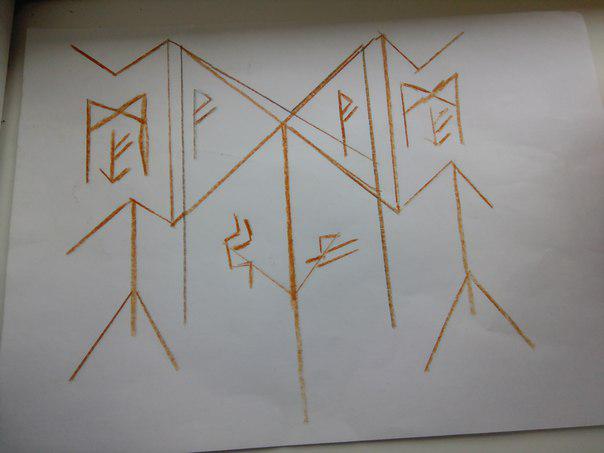 Рабочие руны: манназ, 2 перто, 2 боковых манназ, 2 боковых феху, 2 перев. Тейваз, 3 тейваз, 2 перев. Альгиз, альгиз, осс, феху, 2 райдо, дагаз, 2 вуньо и 2 феху в дагазе.