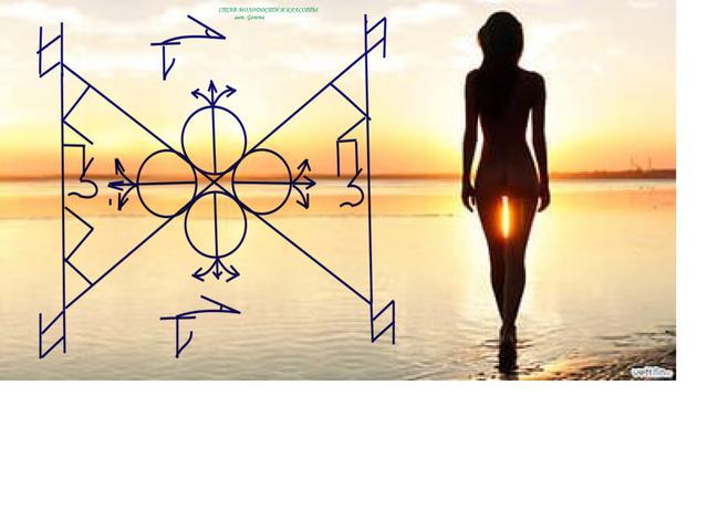 Став состоит из древнего знака возврата молодости, красоты и привлекательности, алфавита Ицхака, рун Унарха и др и пр. Разбирать не надо, оговаривается целиком.
