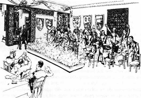 Торраблот, проводимый археологическим обществом в первый день Торри, 1881 г., как написано в прессе. Иллюстрация Sigurður Valur Sigurðsson, 1986 г.