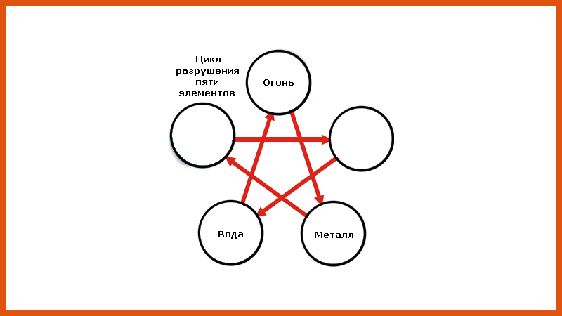 Кроме двух приведенных выше способов взаимодействия, пять элементов фэншуй могут разрушать друг друга. Например, огонь способен сделать металл жидким. А вода с легкостью заливает огненную стихию. Как это происходит, можно увидеть, когда выплескивается вода из ведра на тлеющие полена костра.