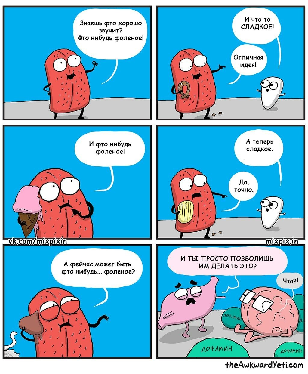 Нейромедіатор дофамін є, у широкому сенсі, гормоном мотивації, саме він забезпечує відчуття інтересу до чогось та задоволення від результатів своєї роботи. Його вироблення налагоджується у глибокому дитинстві, коли ви навчаєтеся завʼязувати шнурівки та доносити ложку до рота. Саме його вироблення мотивує тіло досягати – воно отримує дофамін, як конхвєту, зароблену працею. Ви робили, робили, переривали, старалися, і мозок, як віслючок за морквою, біг за примарною склянкою своєї улюбленого гормонального кайфу. І ось, ви досягли: дійшли, доробили, вийшло, віднайшли потрібне, зʼїли бажане.. І ось цей кайф, коли ви нарешті поклали до рота бажаний кусень, викликається у вас саме дофаміном. Спалах задоволення кОпає й усю іншу систему – за нею постають гормони радості та щастя, тіло розслаблюється, і вам добре.