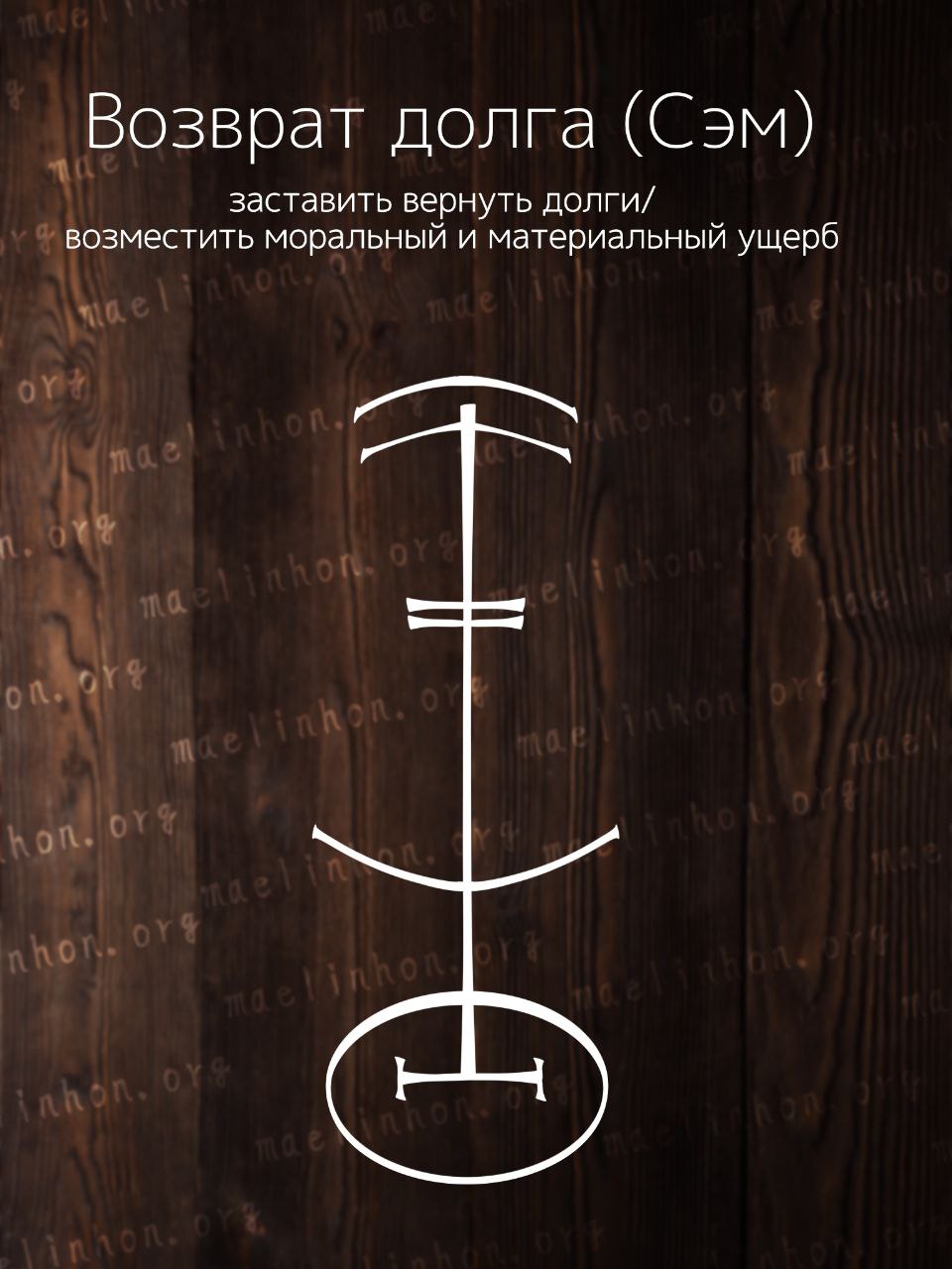 Руну эту нужно наносить на белую бумагу, черной ручкай, а сзади бумаги имя должника, потом сказать (как взял у меня ты раб(имя) так ты и вернёшь мне (имя своё) да будет так.