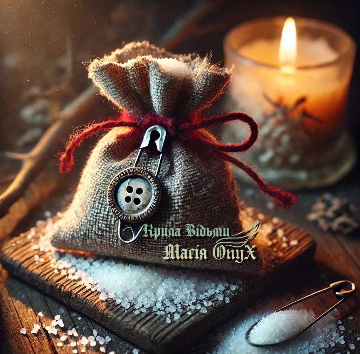 2. Покладіть перед собою сіль, булавку та ґудзик. Заплющте очі й зосередьтеся на намірі створити захисний амулет. Беручи до рук кожен предмет, промовляйте наступні слова: