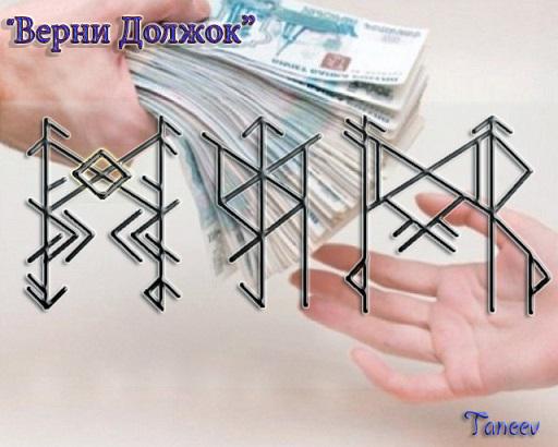 Ансуз+Турисаз+Наутиз+Вунью(пп) — Внушение должнику навязчивых мыслей о необходимости возврата долга. Лишение его покоя, сна, должник впадает в депрессию, не находит себе место — до тех пор пока не отдаст долг.
