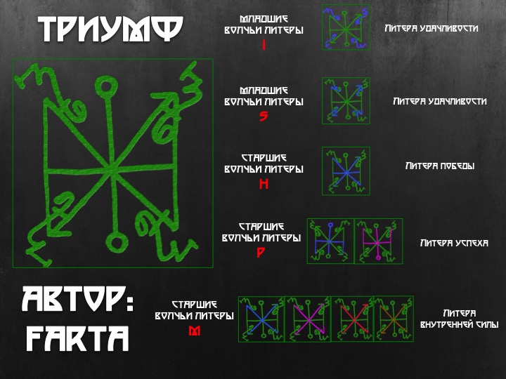 Ну что любители глифов, буков и другой графики, предлагаю вашему вниманию вязь из Волчьих литер «Триумф». Тесты прошел, использовался перед мероприятиями и выступлениями, перед переговорами. У одной девушки дал слабый результат, диагностика показала блоки, после чистки сработал лучше.