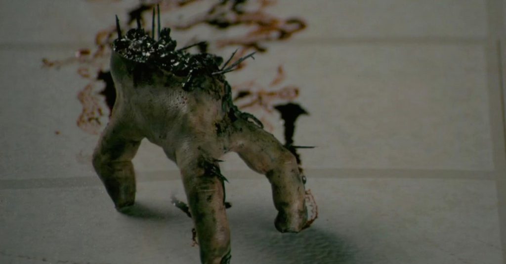 Детали тем временем постепенно собрались в кривобокую и нелепую фигуру из мясных кусков. Откуда то сзади как бы опрокинулась голова — оторванная голова мужчины со сгнившими до черноты глазами, усами и в тюрбане фокусника. Ну мы же в цирке, епт. Всё логично! Вот и Акопян.