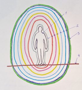 Далее. Тонкие тела у человека по размеру больше, чем физическое тело. Соответственно, их нижние границы находятся не там, где у человека ноги, а намного ниже. То есть, говоря простым языком, они уходят под землю. И именно там будет их граница. Об этом не нужно забывать. Потому, что если поставить структуру только до уровня земли, то получится купол. Такую защиту даже не нужно трогать – ведь внизу все тела открыты, а защита бесполезна. (Рис. 1)