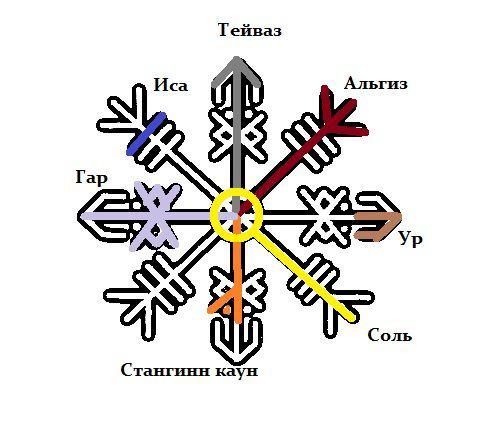 — одна ветвь — Тейваз, Гар (нортумбрийский ряд ), 2 Ур — прямая и зеркальная (исландский ряд) и 2 руны Стангин Каун (исландский ряд). Тейваз и Гар — это наше копье, алебарда, которая выставлена наружу чтобы атаковать поганцев, которые нам решат напакостить, и усиленно рунами Ур (похожа на руну Уруз). Стангин Каун, направленный нашим копьем на врага, дает порчельный заряд, нанося урон. Получается своего рода отравленное копье, которое бьет врага.