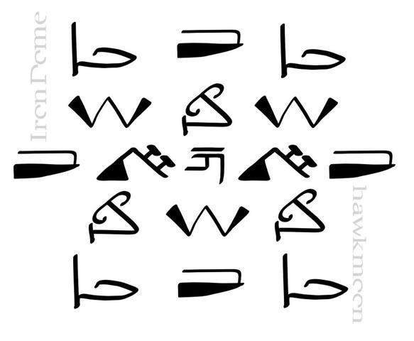 От центра (слева, справа) две литеры алфавита Аарона «Нет» — блокируют все оговоренные оператором возможности некого процесса и достижения цели противником.